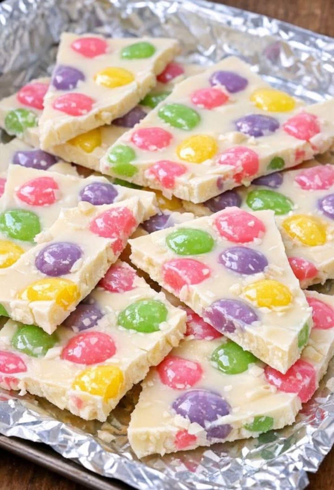 Imagine silky white chocolate, melted low and slow until perfectly smooth, then scattered with bright, chewy pastel candies that create a confetti-like crunch in every bite. It’s the kind of treat that feels homemade and heartfelt—perfect for Easter gatherings, spring celebrations, or sweet gifting.