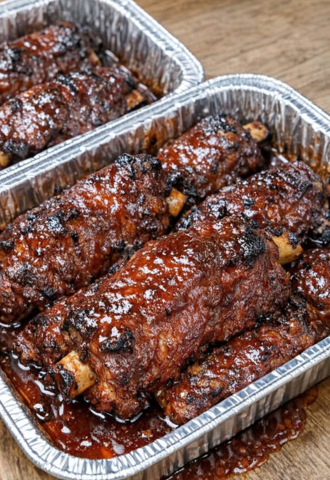 11. Rest and Serve: Remove the trays from the oven and let the ribs rest for a few minutes. Spoon any pooled sauce from the bottom of the trays back over the ribs for that extra sticky, saucy finish. Serve hot, right in the foil trays, for a casual, family-style meal. Don’t forget extra BBQ sauce on the side for those who like their ribs extra saucy!