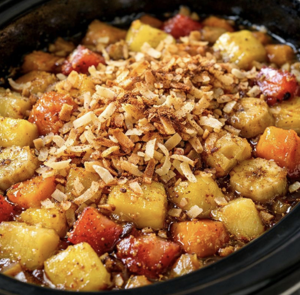 The slow cooker does all the work. The fruit thaws and releases its juices, the brown sugar and cinnamon infuse everything with warm, caramel-like sweetness, and the butter adds richness. The result is a thick, syrupy, bubbling fruit bake that tastes like a tropical vacation in a bowl.