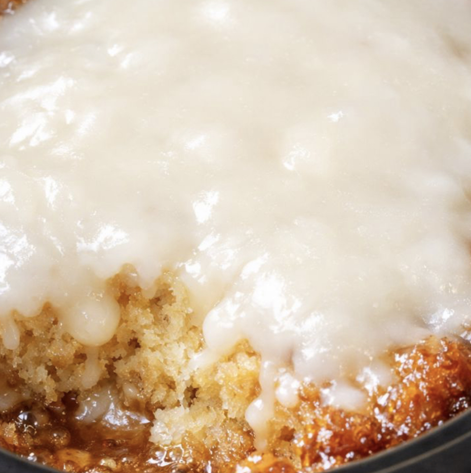 Let the glazed cake sit for another 10 minutes so the glaze can set slightly while still remaining soft and luscious. Scoop the cake out with a large spoon or cut into squares directly in the crock, making sure each serving includes some of the bubbling, caramelized edge and plenty of thick white glaze. Serve warm, and refrigerate any leftovers once cooled.