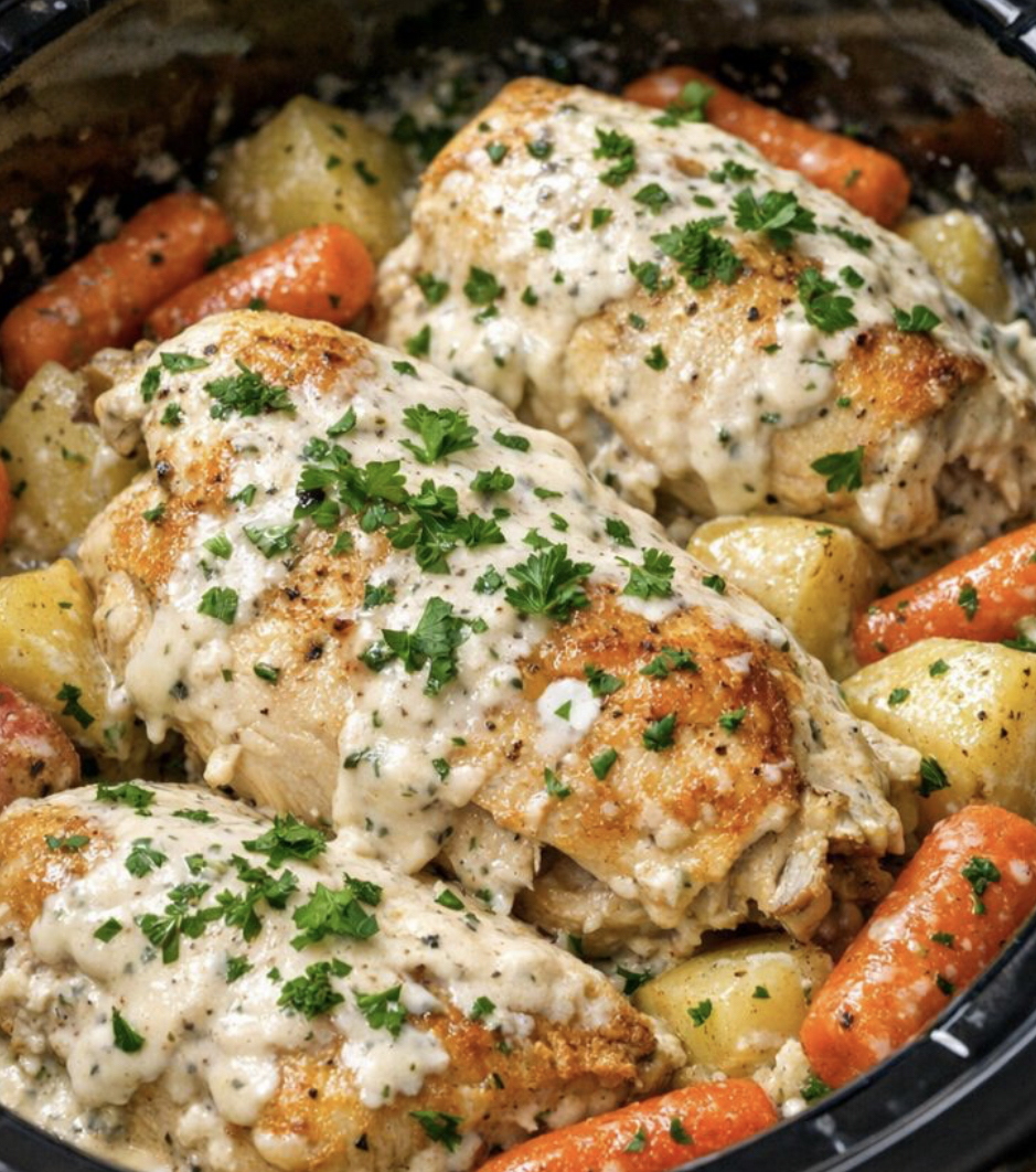 The slow cooker does all the work, transforming the chicken into tender, fall-off-the-bone perfection. The skin-on, bone-in breasts stay incredibly moist and flavorful, and the creamy ranch sauce becomes a rich gravy that’s perfect for spooning over mashed potatoes, rice, or egg noodles.