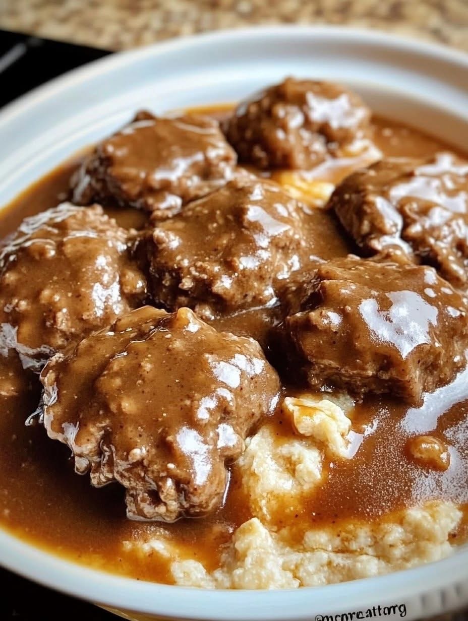 Bake: Place the browned patties in a baking dish. Pour the gravy over the top. Cover with foil and bake at 350°F (175°C) for 30–40 minutes, until hot and bubbling.