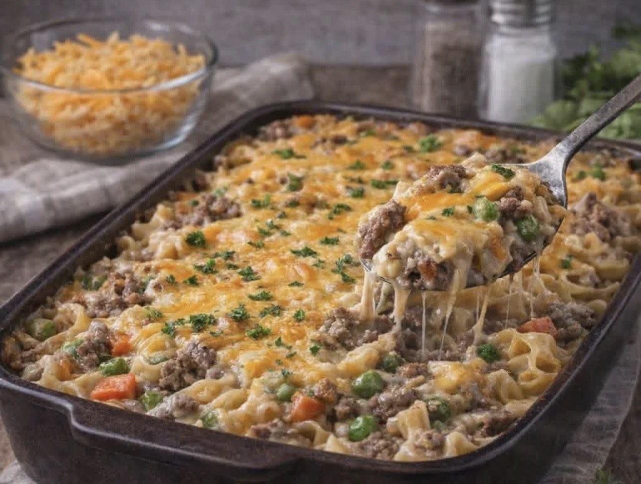 The beauty of this Amish Sunday Savior casserole is its flexibility and forgiveness. The base of ground beef and egg noodles provides protein and carbohydrates that satisfy hungry appetites. Cream of mushroom and cream of chicken soups create a rich, savory sauce without requiring a roux or a separate pan. Sour cream adds tanginess and a silky texture. The topping of buttery Ritz crackers or saltines delivers a crunchy contrast to the creamy filling. Every ingredient is a pantry staple, and you can substitute what you have on hand without ruining the dish.