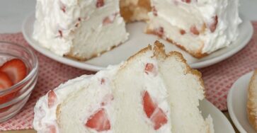 Ingredients: 1 pre-made angel food cake (10 ounces), cut into 1-inch cubes 1 (21-ounce) can strawberry pie…