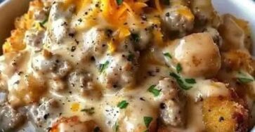 Ingredients: 4 cups frozen tater tots 1 pound breakfast sausage 3 tablespoons all-purpose flour 2 cups milk Salt and black…