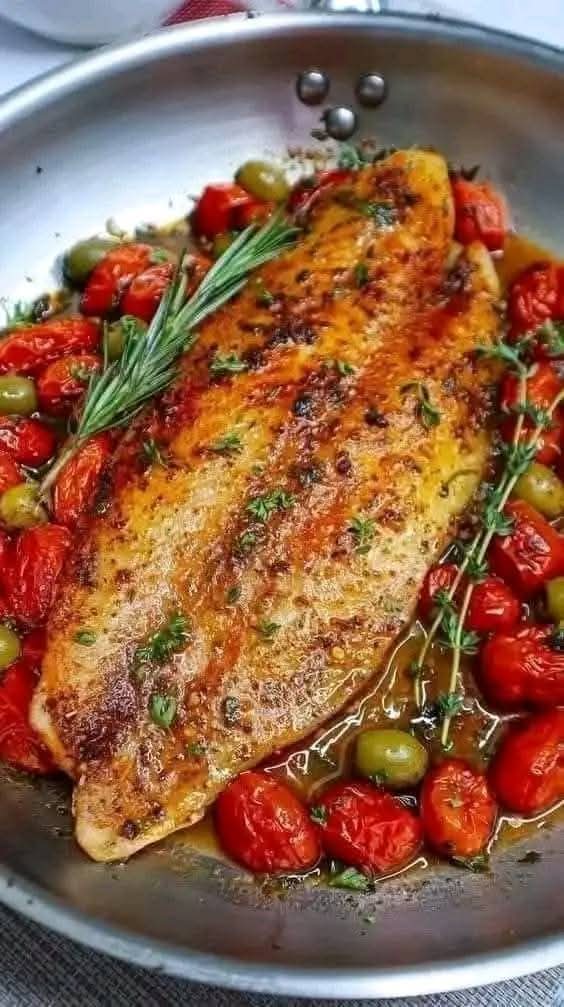 Lay the seasoned fish fillet on top of the cherry tomatoes and olives in the baking dish.
