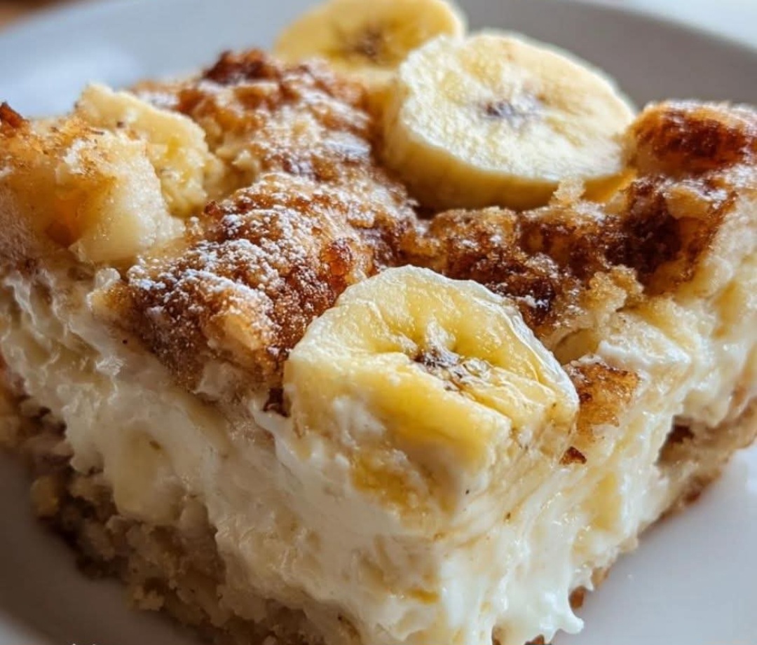 The magic happens in the oven: the batter rises around the bananas, the cream cheese swirls melt into velvety ribbons, and the top turns perfectly golden with a soft, cake-like bite. This is the kind of dessert that makes people go back for seconds… and then “just one more spoonful.”