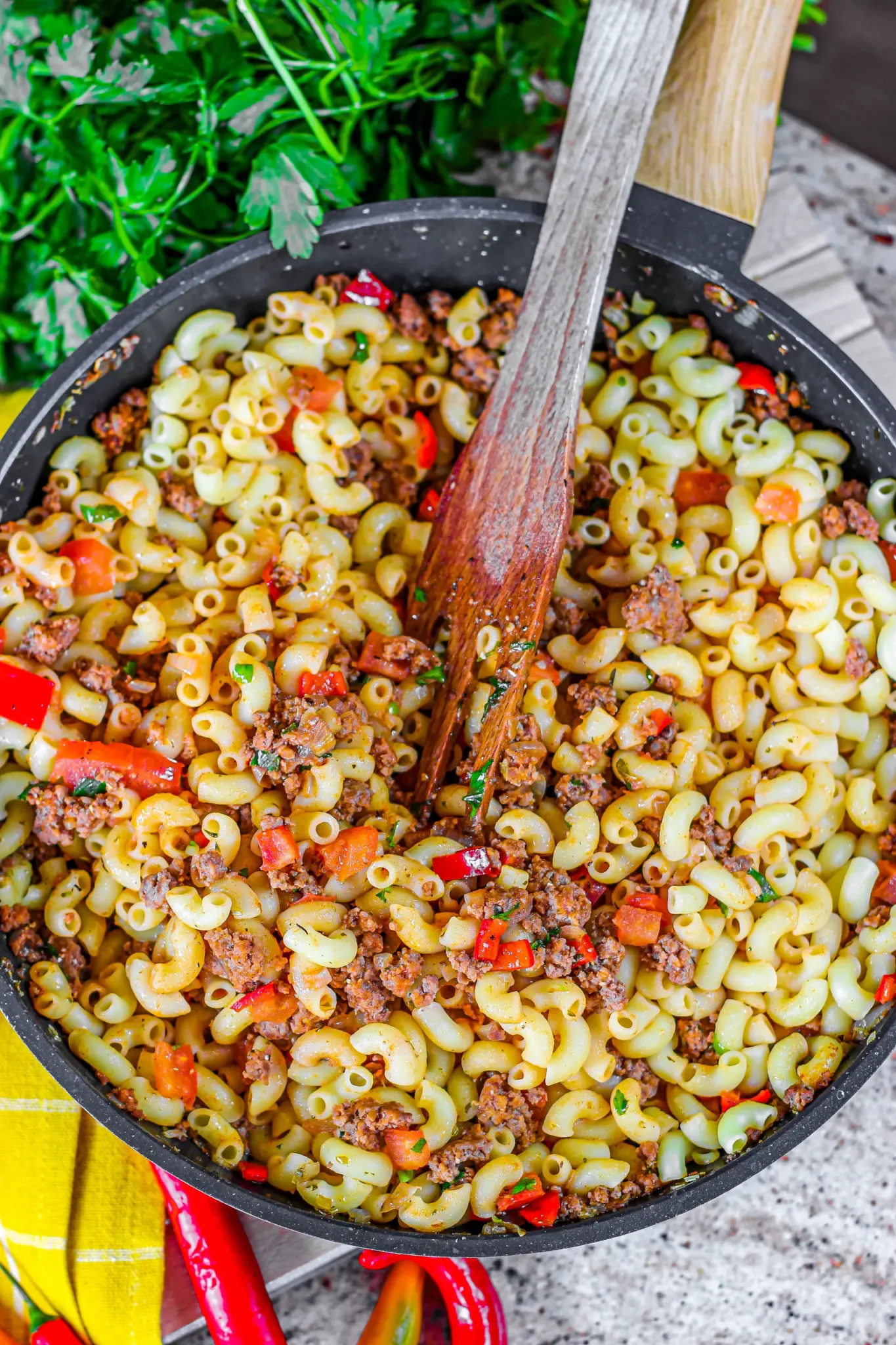 One-Pot Wonder – Meat, pasta, and veggies all come together in one skillet.
