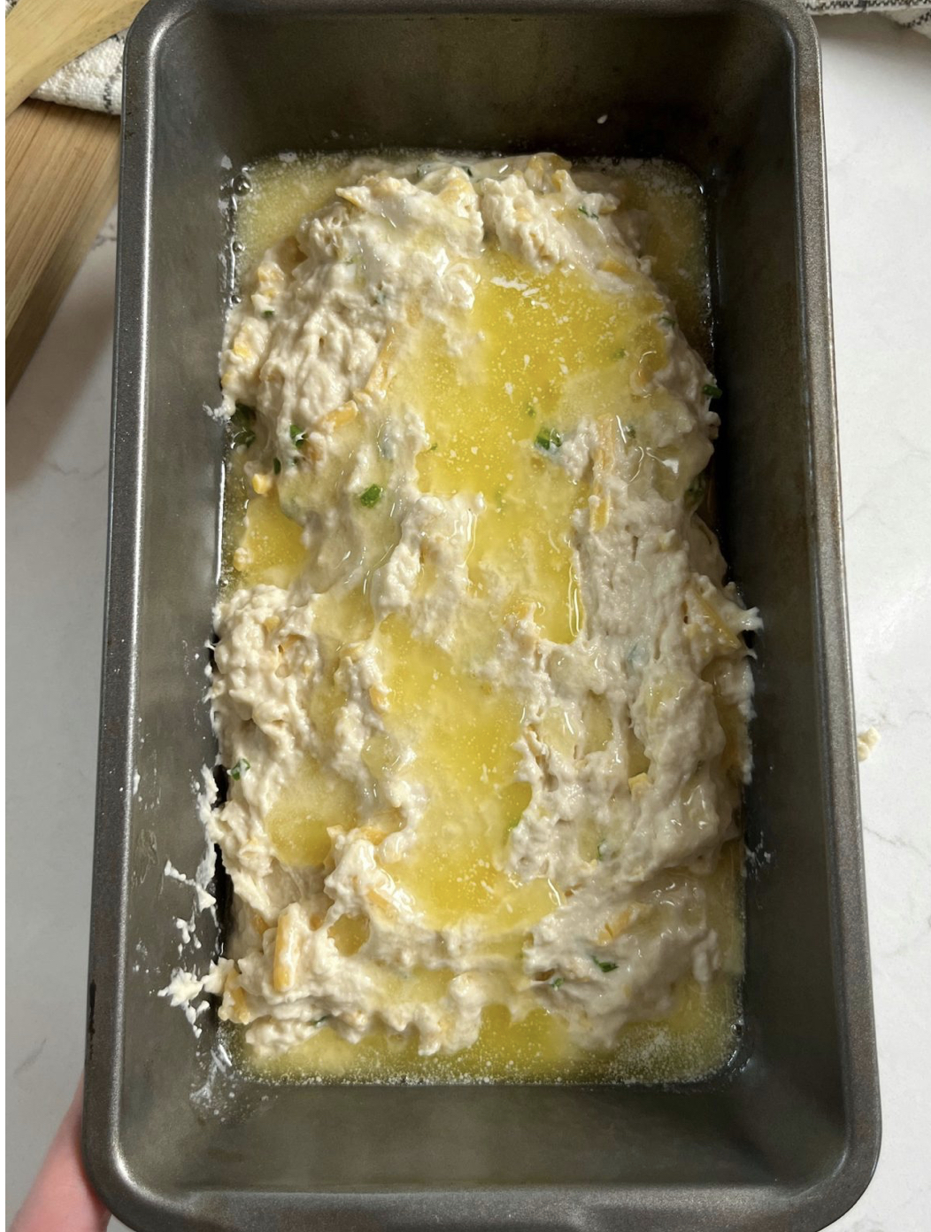 5. Transfer batter into the prepared pan and drizzle with the melted butter.