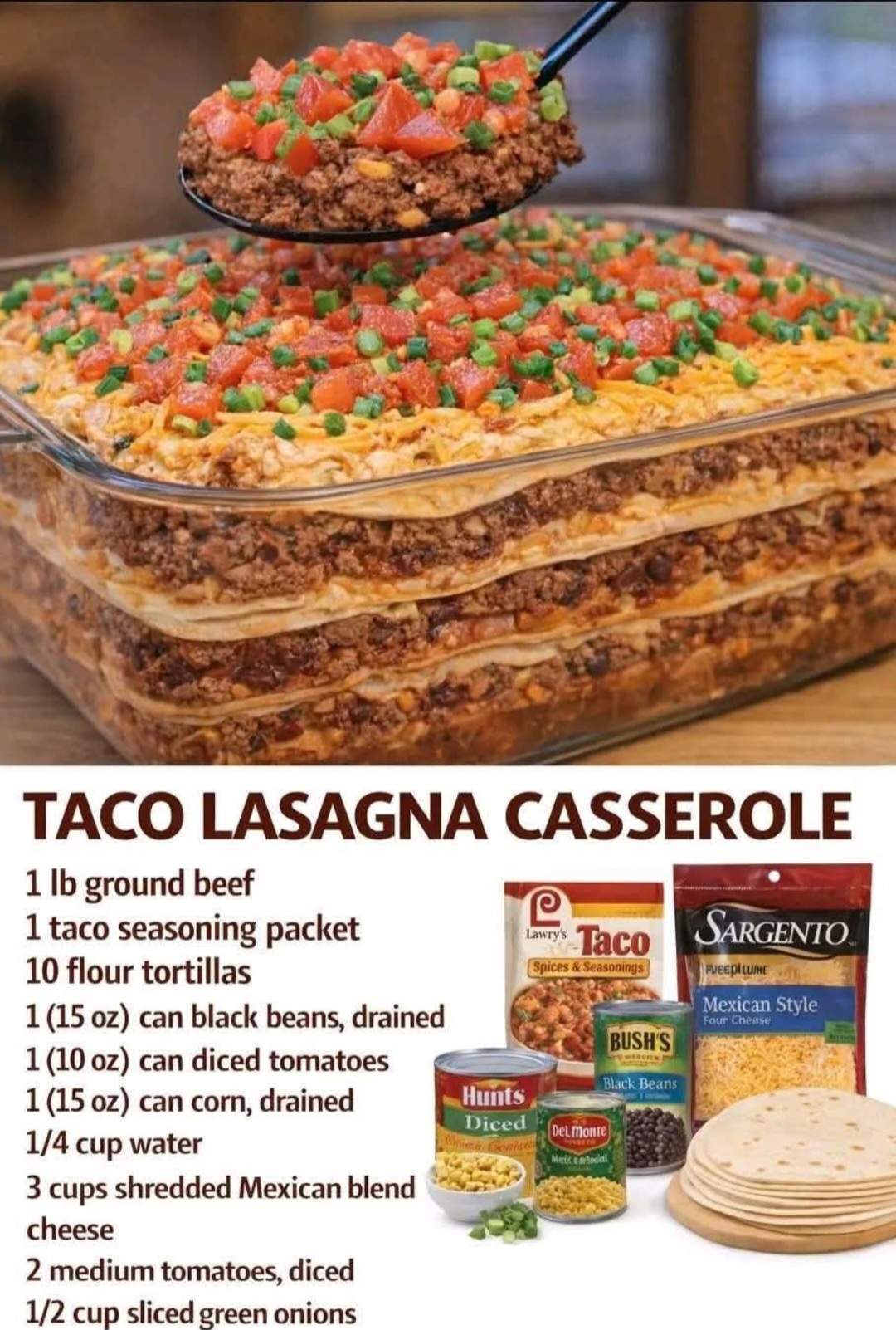 Taco Lasagna is the ultimate comfort-food fusion. It layers tender lasagna noodles with seasoned taco meat, creamy sour cream, zesty salsa, beans, corn, and loads of melted cheese. Every bite delivers big taco flavor with the cozy, baked goodness of lasagna. Perfect for family dinners, potlucks, or meal prep — this dish disappears fast!