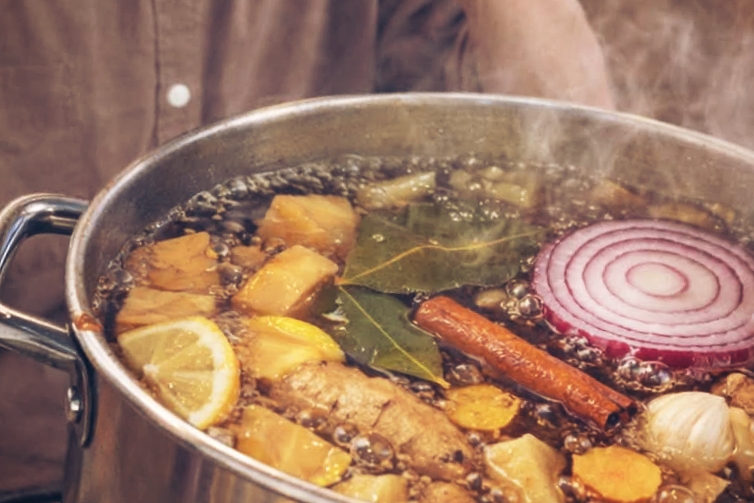 Boiling Cinnamon, Cloves, Garlic, Ginger, Lemon, and Onion
