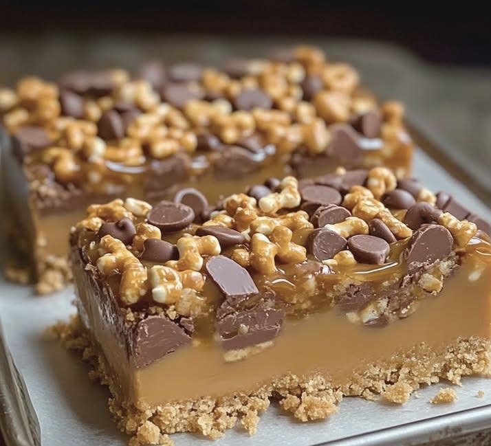 These bars are everything dessert lovers crave: chewy, crunchy, sweet, and slightly salty. The classic Butterfinger candy adds a signature peanut-butter crunch that pairs beautifully with rich caramel and silky chocolate. Best of all, they’re simple to make and slice easily into neat, bakery-style squares.