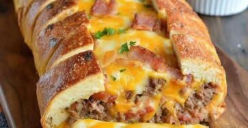 This savory, shareable baked treat is inspired by a cheeseburger, featuring seasoned ground beef, cheese, bacon, and pickles all rolled…