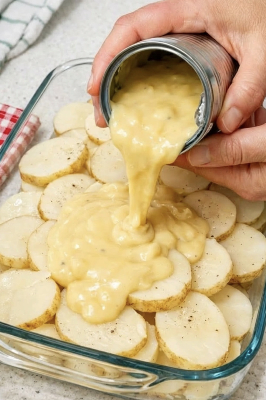 Arrange half of the potato slices in the prepared baking dish, overlapping slightly. Pour half of the sauce evenly over the potatoes. Repeat with the remaining potatoes and sauce.