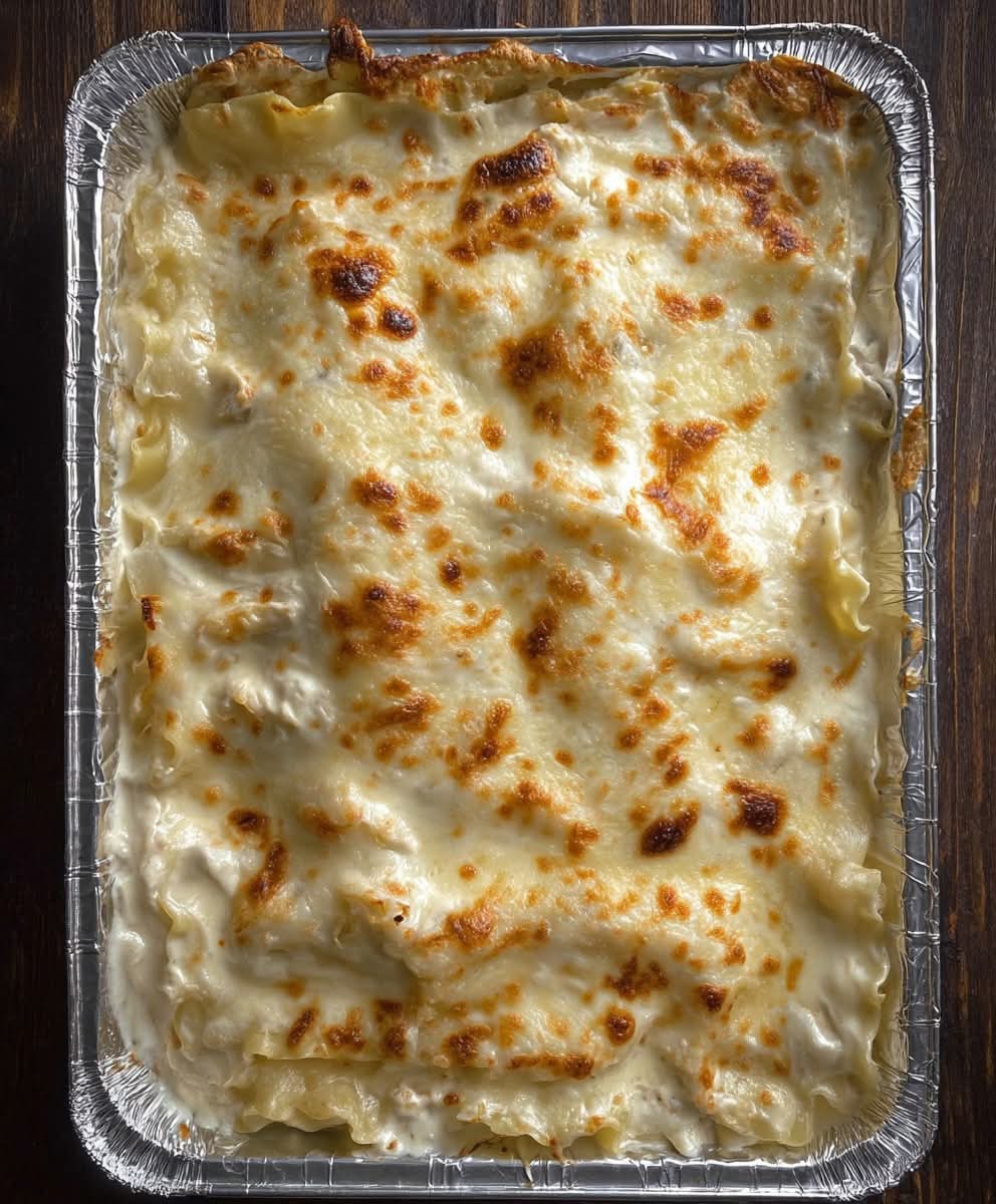 Add a spoonful of the Alfredo mixture to the bottom of your prepared baking dish and spread out evenly. Arrange a layer of noodles over the sauce.