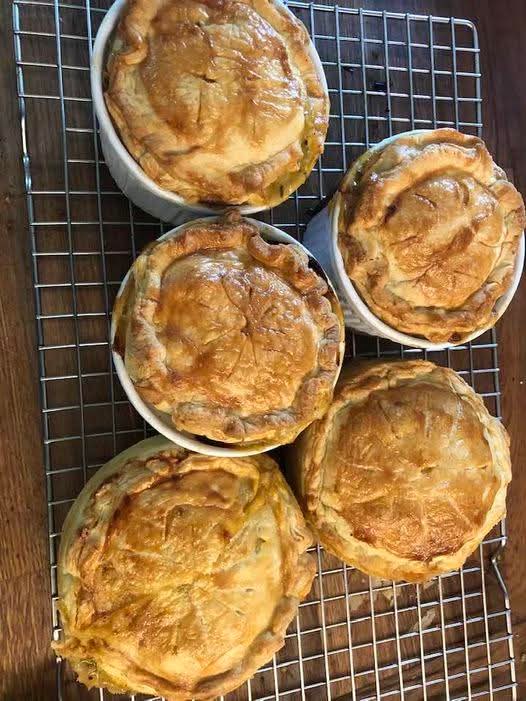 Divide the cooled filling between the pie dishes. Place pastry on top of each pie. Seal the pastry edges together then brush with the egg.