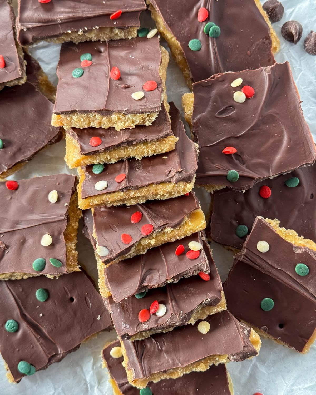 While the chocolate is still soft, sprinkle on Christmas sprinkles, M&Ms, or crushed candy canes.