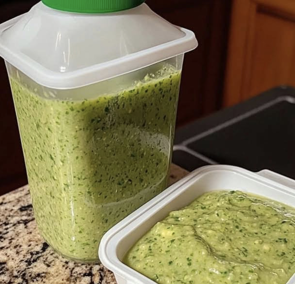 In a blender, combine the avocados, fresh cilantro, crema mexicana, minced garlic, chicken bouillon powder, salt, lime juice, and white onion.