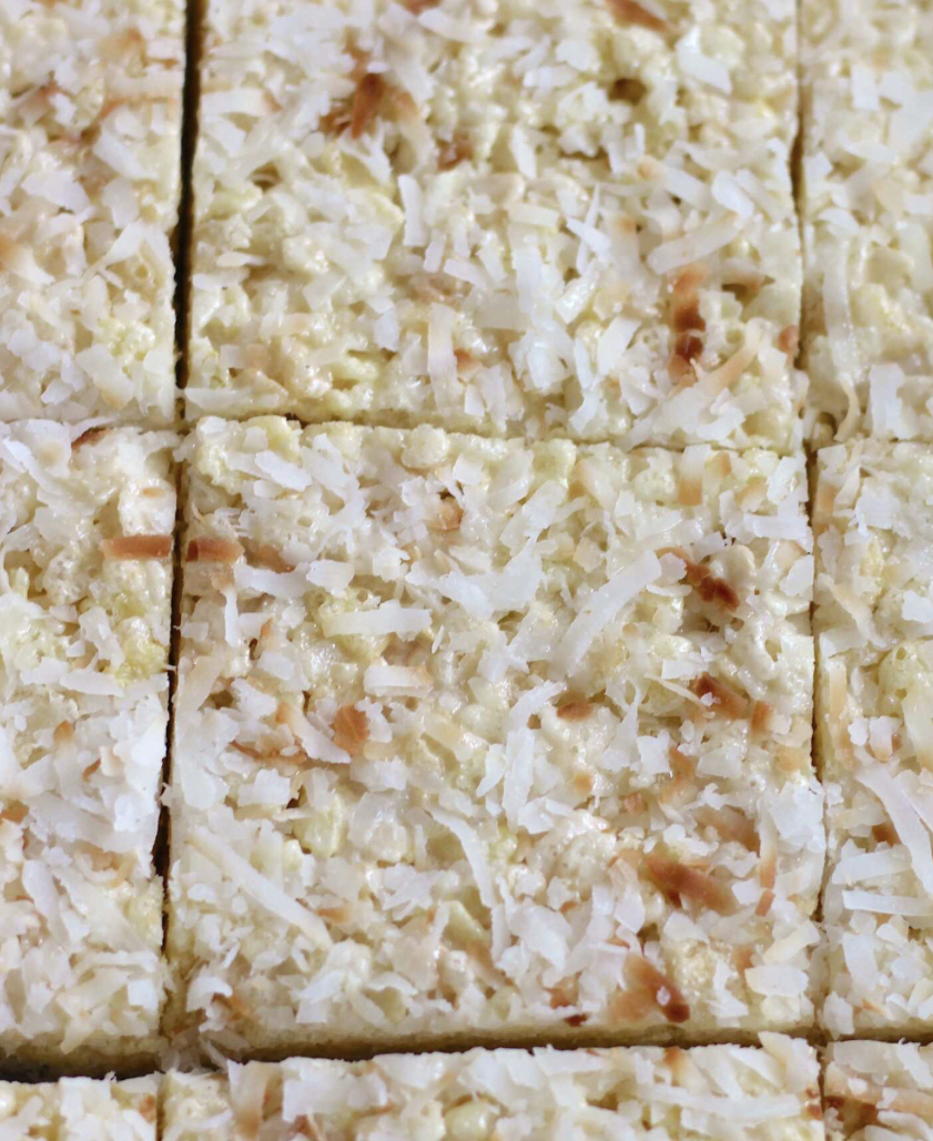 Let the coconut crisp treats cool completely at room temperature, about 30 minutes. Once firm, cut into squares or rectangles.