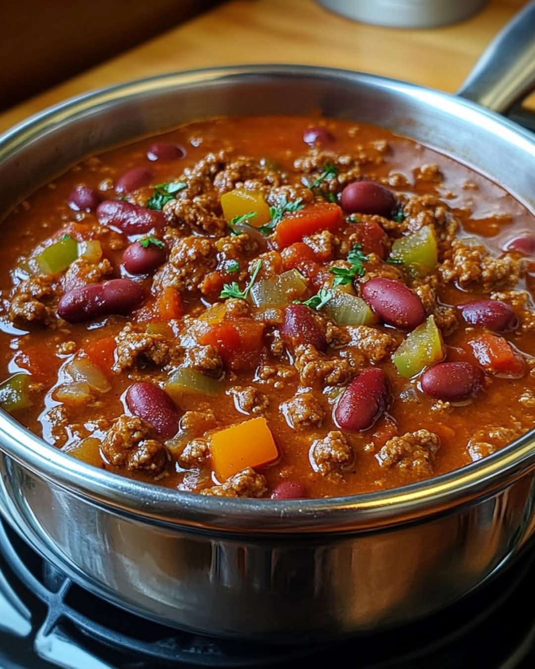 Cover the pot and let the chili simmer for 1 to 1 1/2 hours, stirring every 15 minutes.