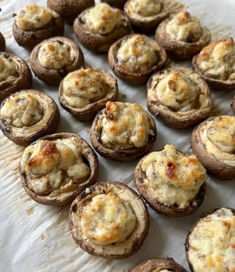 Arrange the mushrooms on a lined baking sheet. Bake for 18–20 minutes, or until the tops are lightly golden and the mushrooms are tender. -
