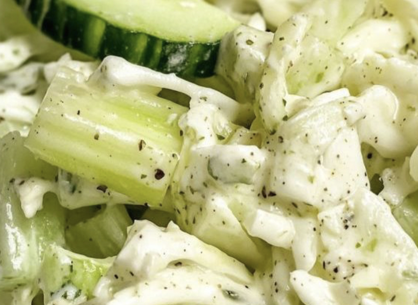 In a large mixing bowl, add the shredded cabbage, cucumbers, celery, and grated carrots. Toss gently to mix the textures together.