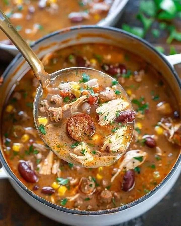Ajoutez du poulet cuit, des saucisses, des haricots rouges, du maïs blanc, des piments verts, des flocons d’oignons, de la poudre d’ail, du cumin, de la poudre de piment et Remuer pour combiner.
