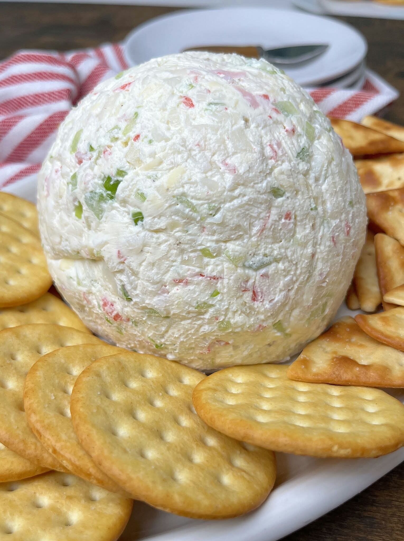 Serve: Unwrap the chilled crab cheese ball and place it on a serving plate. Serve with an assortment of crackers, pretzels, or fresh veggie sticks (like cucumber slices, carrot sticks, or bell pepper strips).