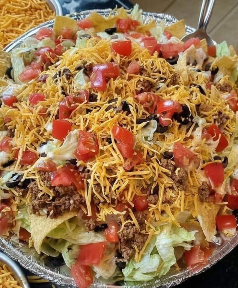 I have been making this forever… But I get individual bags of Doritos… Everybody gets a bag and u put ur toppings inside and eat it right from the bag