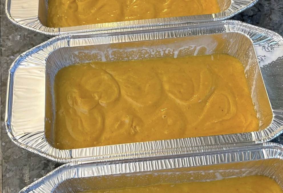 Divide the batter evenly between the two prepared loaf pans, smoothing the tops with a spatula.