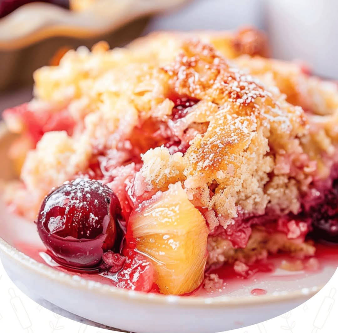 Step 4: Top with Cake Mix Sprinkle the dry yellow cake mix evenly over the fruit layers. Use a spoon to gently spread it if needed, but don’t mix it into the fruit below.