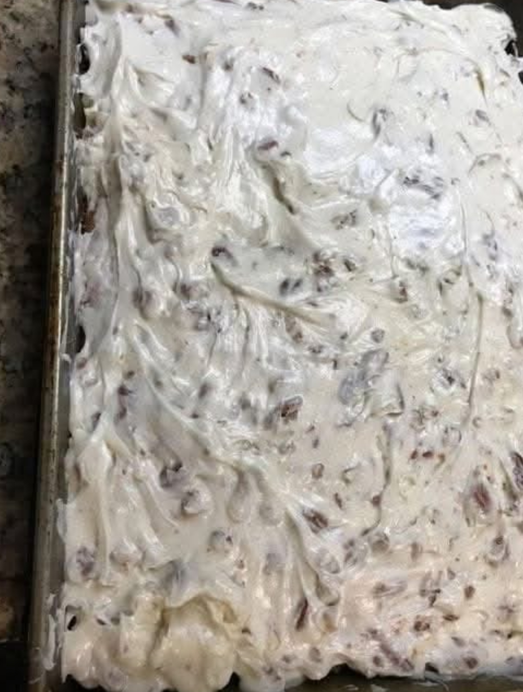 Drop dollops of frosting over the cooled cake, then gently spread to cover the surface, being careful not to disturb the pineapple glaze beneath. For extra flavor and crunch, sprinkle additional pecans on top.