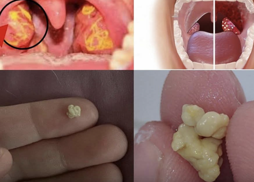 Tonsil stones, also known as tonsilloliths, are small, whitish-yellow, pimple-like growths that can develop in the crevices of your tonsils. They’re formed when food particles, dead cells, mucus, and bacteria get trapped in the tonsil crypts (small pockets in your tonsils). Over time, these trapped materials harden into calcified masses.