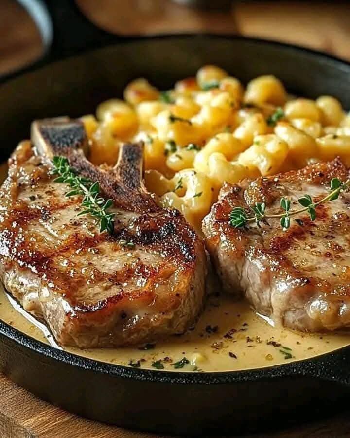 First, preheat your oven to 375°F (190°C). Take a skillet and melt the butter over medium heat. Season your pork chops with salt, pepper, thyme, and paprika, and then sear them in the skillet for about 4-5 minutes on each side until they turn a beautiful golden brown. Once done, set them aside. Using the same skillet, give the garlic a quick sauté until it becomes fragrant.