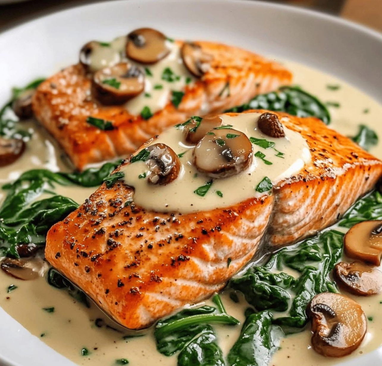 Garlic Butter Salmon with Spinach & Mushrooms in Creamy Sauce