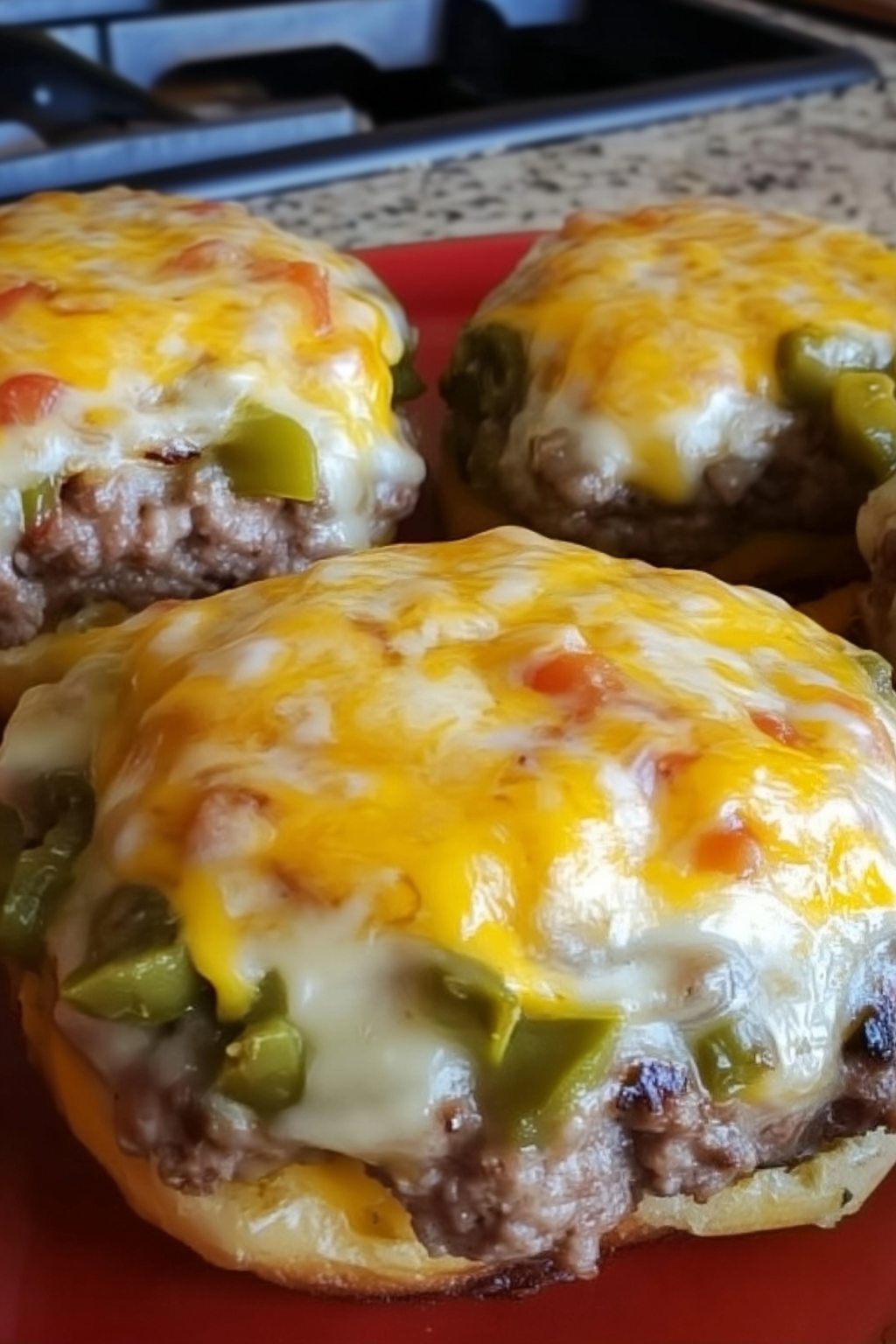 3. Add the cheese & chiles – In the last minute of cooking, top each patty with cheese and a generous spoonful of roasted green chiles. Cover the pan or close the grill lid so the cheese melts beautifully.