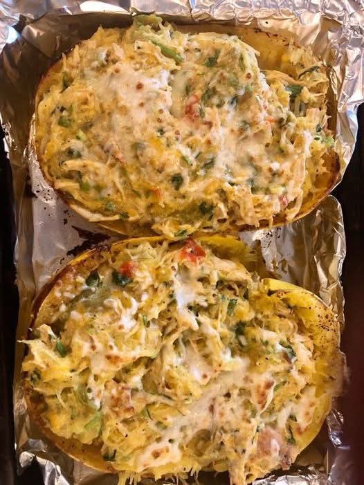 Divide the filling evenly and spoon it back into the two empty spaghetti squash shells.