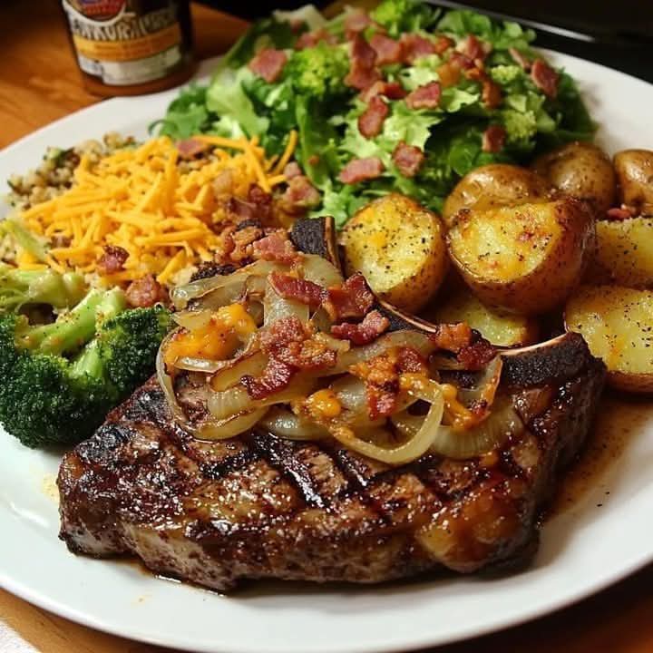 Top the steak with caramelized onions, crumbled bacon, and shredded cheese. Place under the broiler for 1–2 minutes to melt the cheese.