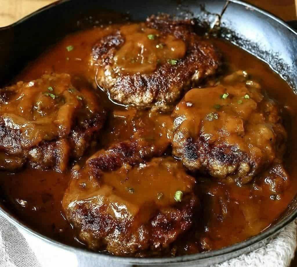◦ Return the cooked patties to the skillet, nestling them into the onion gravy.