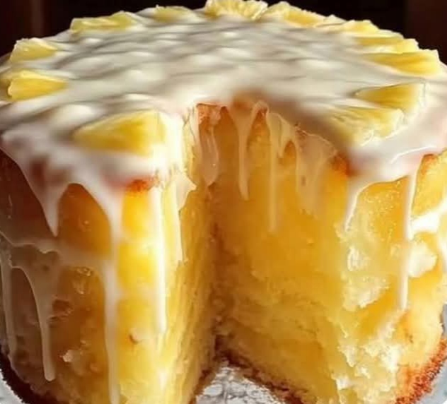 1. While the cake is still slightly warm, drizzle the pineapple glaze over the top, letting it drip down the sides.