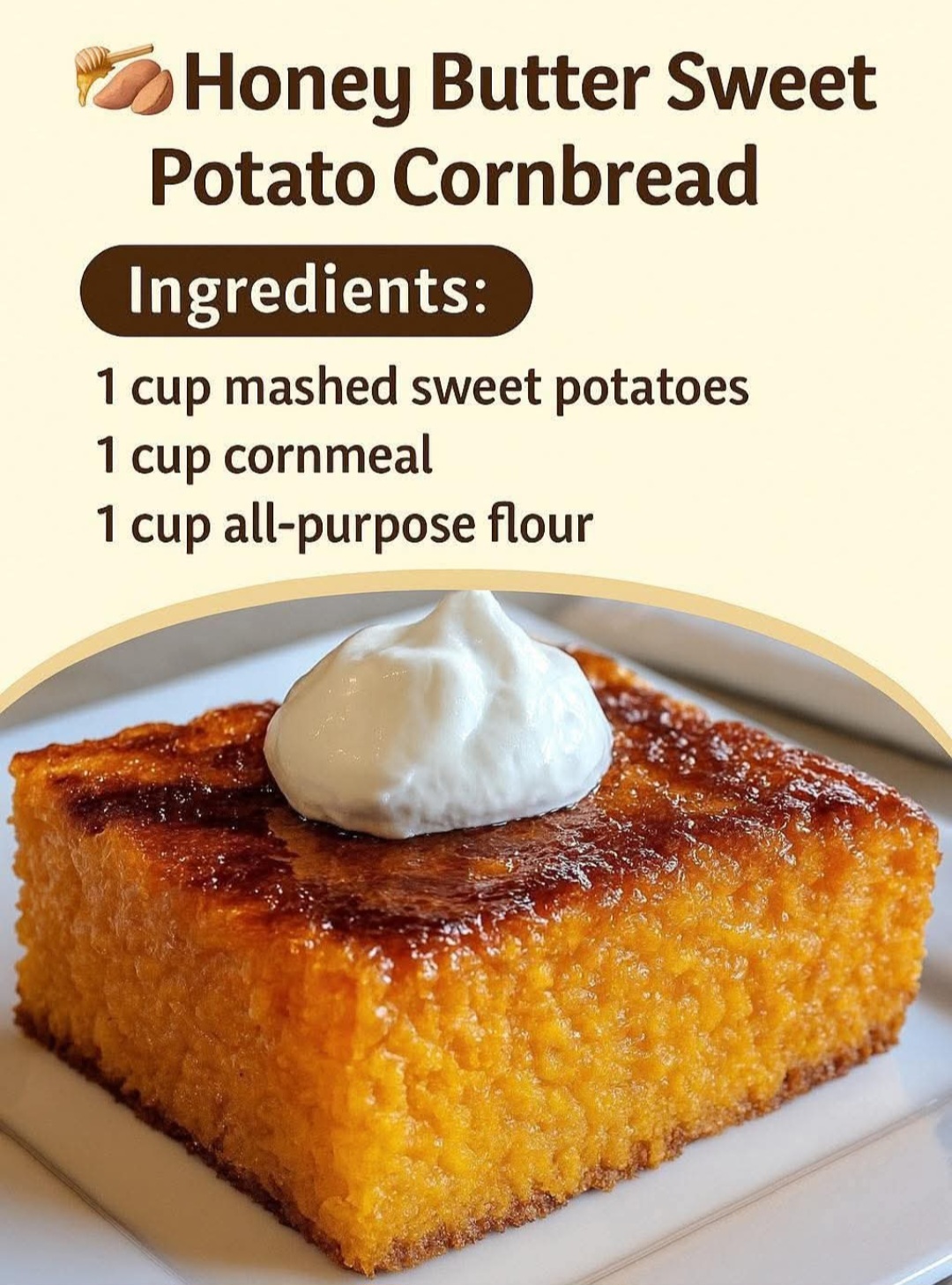 In a world full of complex recipes, our Honey Butter Sweet Potato Cornbread stands out as a beacon of delicious simplicity and unparalleled flavor. It’s a testament to how a few thoughtful ingredients, combined with easy-to-follow steps, can create something truly extraordinary. This cornbread isn’t just an item on your menu; it’s a warm, inviting experience that promises to be a new family favorite. From its golden crust to its moist, sweet interior, every bite is a journey of comfort and joy, perfectly crowned with a dollop of our luscious homemade honey butter. Stop searching for the perfect cornbread recipe – you’ve found it. Bake it, share it, and watch as it quickly becomes the most requested dish in your repertoire. It’s easy to make, impossible to resist, and guarantees to outrank any other cornbread you’ve ever tried.