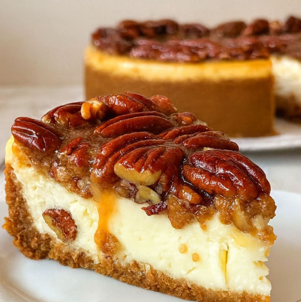 7. Spoon the pecan mixture evenly over the cheesecake batter, spreading gently to cover the surface without mixing the layers.