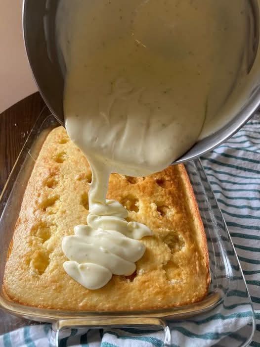 Let cool for 5 minutes, then poke holes all over cake with the handle of a wooden spoon, but don’t poke through to the bottom. Set aside.