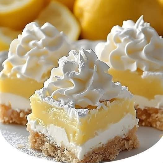 11. Cut into squares, top with whipped cream, lemon slices, and a dusting of powdered sugar.