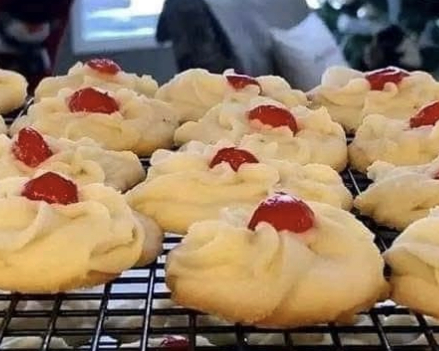 Scoop or pipe the dough onto a parchment-lined baking sheet. If using candied cherries, place half a cherry in the center of each cookie.