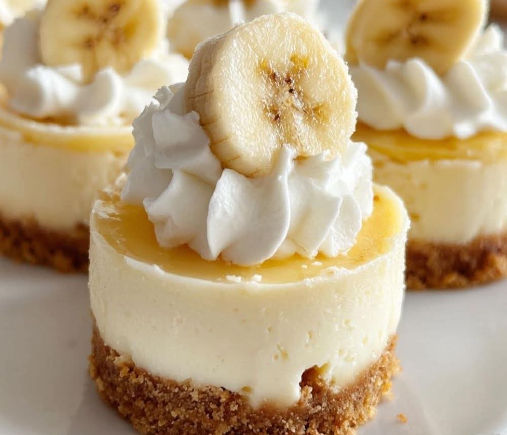 9. Before serving, top each mini cheesecake with sliced bananas and a dollop of whipped cream. Garnish with vanilla wafers if desired.