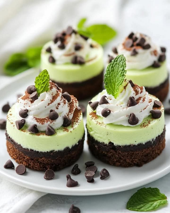 – Top each cheesecake with a dollop of whipped cream, sprinkle with chocolate shavings, and garnish with a fresh mint leaf.