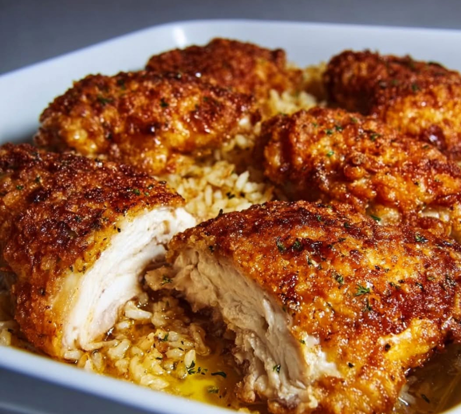 5. Arrange the boneless, skinless chicken breasts on top of the rice mixture in a single layer.