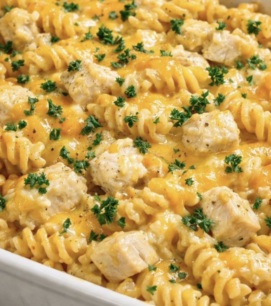 This creamy, no-fuss casserole combines uncooked rotini pasta, tender canned chunk chicken, and a rich cream of chicken sauce. Baked until bubbly and golden, it is the ultimate comfort food made simple.