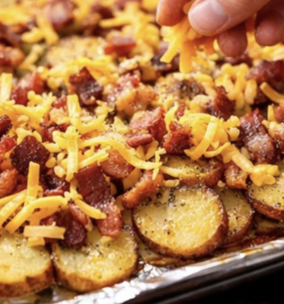 Assemble: When the potatoes are tender and browned around the edges, remove the pan from the oven. Gently nudge the slices closer together to minimize gaps, creating a solid layer of potatoes that will serve as the base for the toppings. Sprinkle the shredded cheddar evenly over the hot potatoes, covering as many slices as possible. Scatter the crumbled bacon over the cheese.